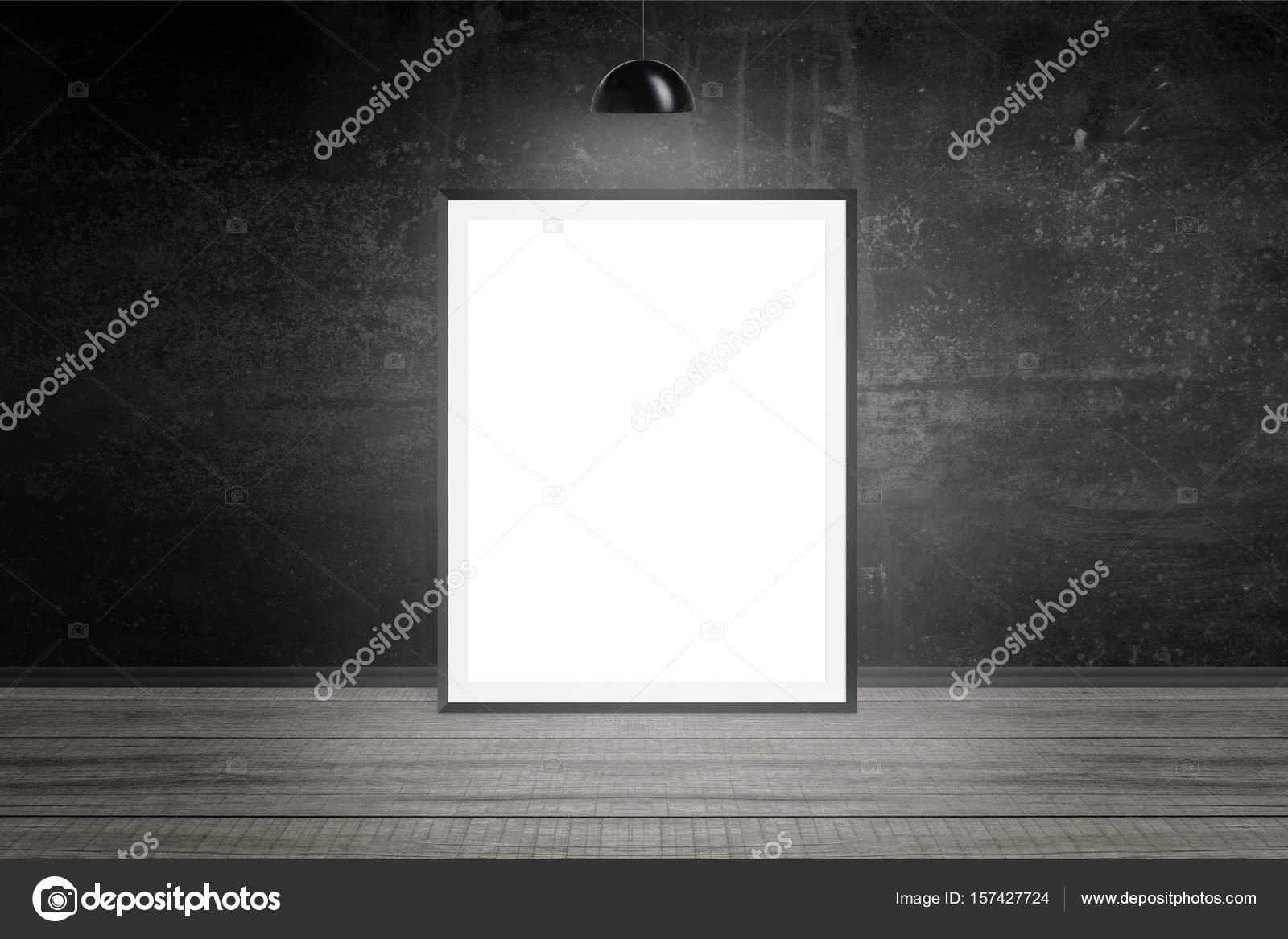 Bilderrahmen Beleuchtet Mit Lampe Leerer Raum Leeres Weisses Papier Fur Attrappen Schwarze Wand Im Hintergrund Holzboden Stockfoto C Vlado85 157427724